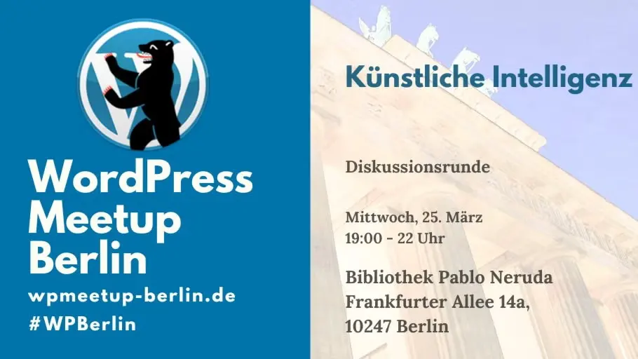 Herzlich Willkommen zum WordPress Meetup Berlin! Auch im Jahr 2026 treffen wir uns weiterhin am letzten Mittwoch des Monats. Wir versuchen, abwechselnd Themen für Anwender*innen und Developers behandeln. Programm19:00 | Einlass19:15 | Thema: Diskussionsrunde zu KI Im April letzen Jahres hatten wir uns zuletzt über unseren Umgang mit künstlicher Intelligenz ausgetauscht. Auch dieses Mal wollen […]